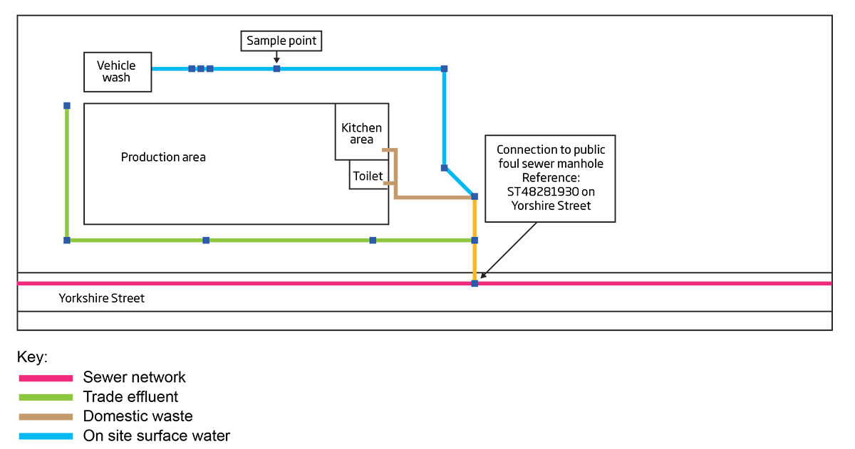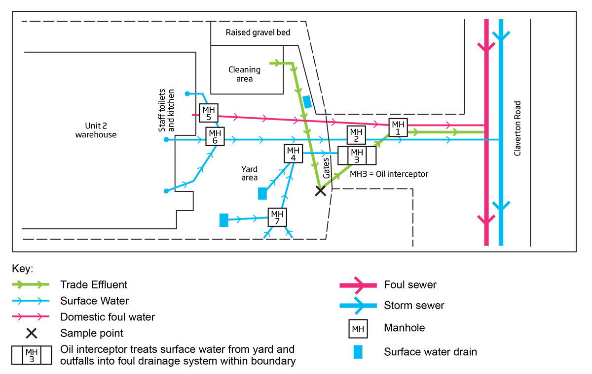 Illustrative examples of an acceptable drainage plans for supporting a TE application. To enable Wessex Water to accept an application, we require a full drainage plan of the site, showing the site boundary, the route of the effluent and where the connection to the public foul sewer will be. In addition, the plan will also need to clearly show the location of your sample point.