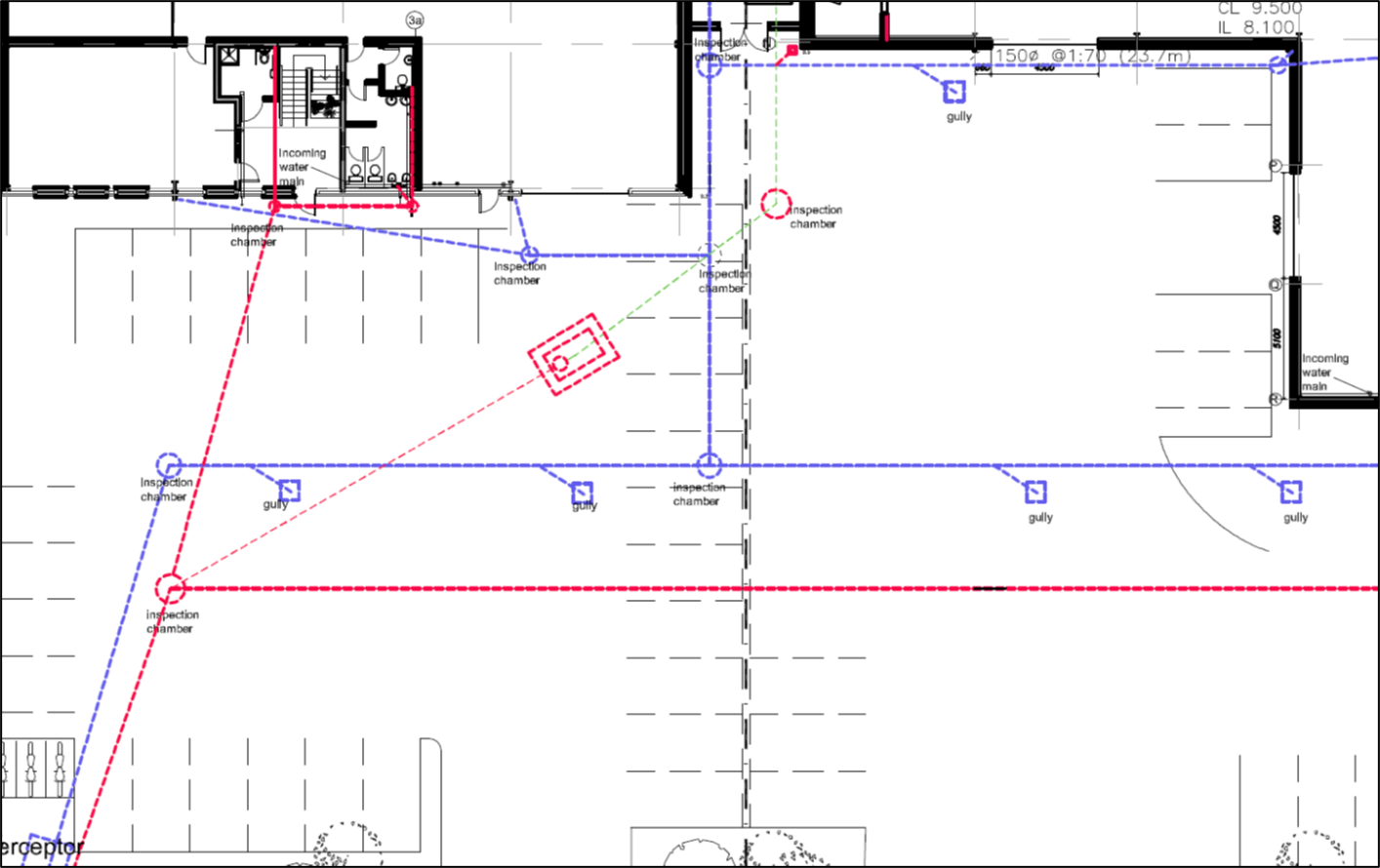 • The outline of any contaminated or uncontaminated areas, and their relevant drainage and discharge points,
